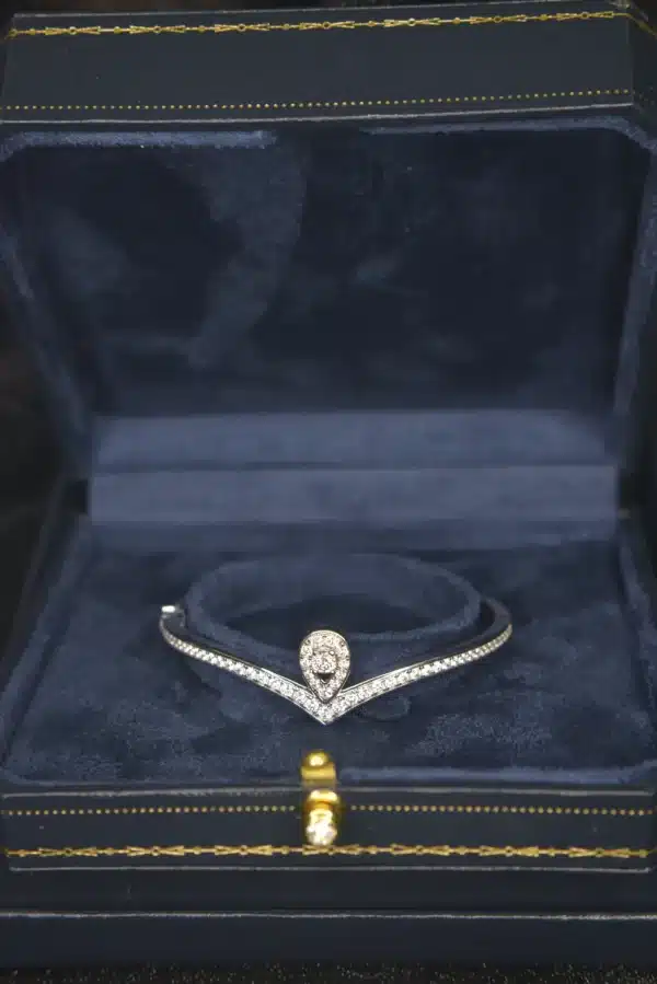 Centered by an 8.3mm D-color cubic zirconia cut to mimic the Cullinan Diamond’s legendary fire, the bracelet ascends through a V-shaped pavé galaxy. Each 1.1mm stone is set at precise declination angles to create a liquid metal illusion – as if molten platinum froze mid-cascade during a coronation. The rhodium plating undergoes quantum-level polishing, achieving a black hole-like light absorption that makes diamonds float against void-dark metal.