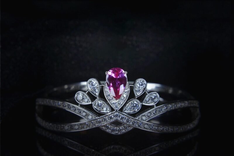Bracelet – A crossover throne. Its DNA-helix bands intersect beneath the violet CZ sovereign, 36 white CZ teardrops forming a diamond parliament. The flexible rhodium lattice expands/contracts like a realm’s borders adapting to its ruler’s will.