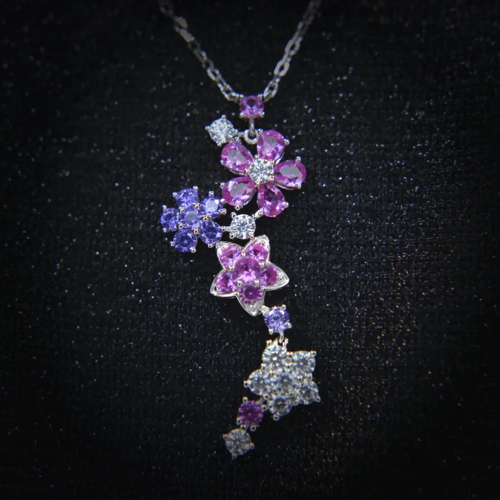 Necklace – A botanical court in miniature. The 17″ chain’s ascending leaf clusters bow toward the central 9.5mm violet CZ, their 1.2mm white CZ “subjects” arranged in Fibonacci deference. The pendant’s oxidized silver vines clutch the gem like Tudor roses embracing the Imperial State Crown.