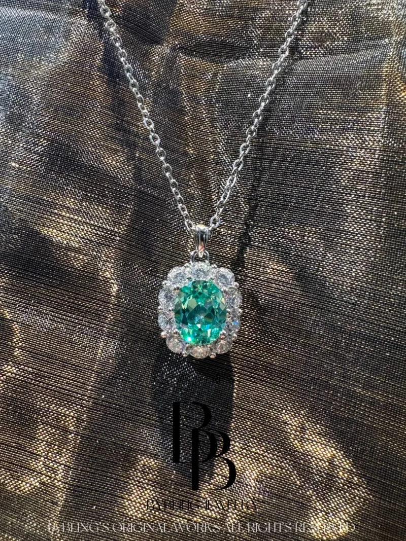 Surrounding this magnificent centerpiece is a halo of lab-made diamonds, each stone twinkling like a dewdrop in the morning sun. Their pave setting forms a seamless carpet of glitter, artfully enhancing the green tourmaline’s luminosity and creating a harmonious and eye-catching composition. The entire ensemble is gracefully cradled in high-quality S925 silver, renowned for its durability and hypoallergenic properties. The silver’s lustrous finish not only provides a sumptuous backdrop but also ensures that this pendant will maintain its gleaming allure through countless wears, becoming a cherished heirloom.