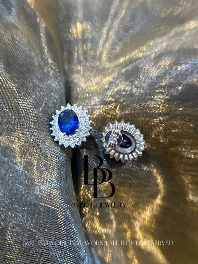 - These clear lab-made diamonds are precision-cut to mimic the scintillating sparkle of diamonds. Their pave setting forms a border of glitter that seems to dance in harmony, artfully arranged to enhance the earrings’ overall allure and bestow an air of opulence. They play the role of loyal attendants, surrounding the sapphire and highlighting its splendor, as if they were the supporting actors enhancing the lead’s presence on a grand stage.