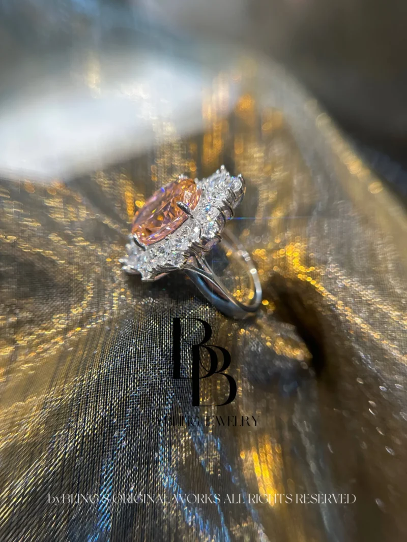 - Design: This breathtaking ring features a vibrant oval-cut padparadscha cubic zirconia in the center, surrounded by a halo of marquise-cut and round-cut cubic zirconia diamonds. The intricate stone arrangement radiates elegance and brilliance, with the warm peach-pink hue of the padparadscha serving as the focal point. The entire piece is set in high-quality S925 silver for lasting luxury and durability.